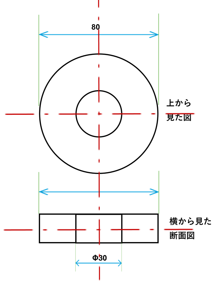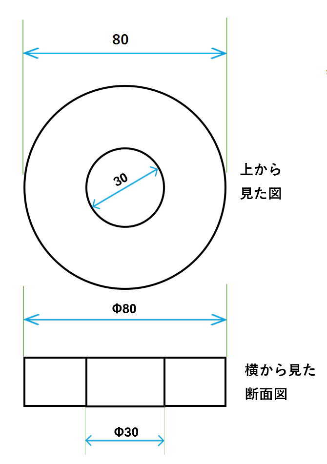 | 断面図のように、円とわからない場合は、「Φ80」のように、数字の前に「Φ」をつけましょう。 これが、「ココは円ですよ!」という意味になります。 |