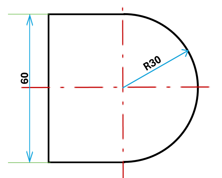| 図のように、形の一部に半円が付いているような図形の際は、中心から外周に延びる寸法線を用います。 |